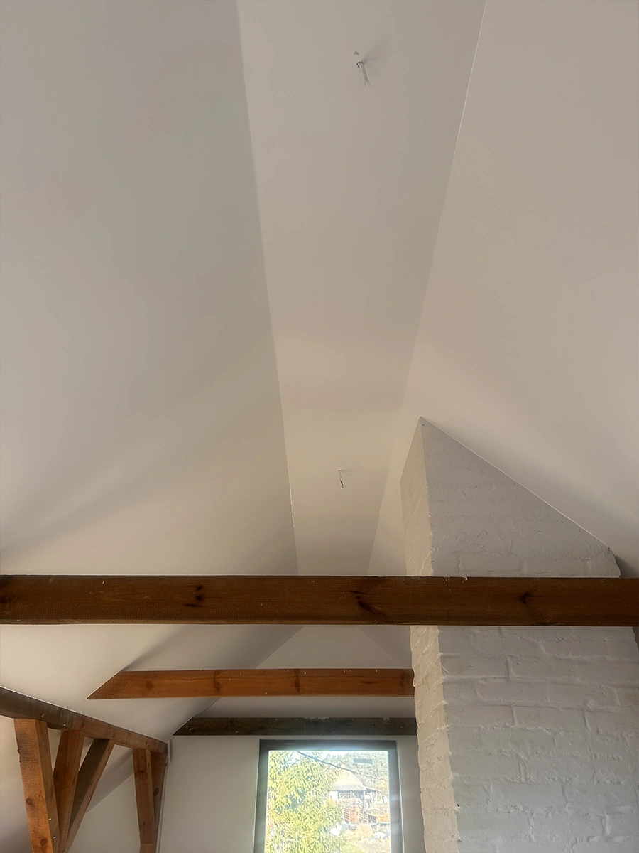 Po wykonaniu izolacji przystąpiliśmy do montażu płyt g-k. Każdą płytę precyzyjnie dopasowaliśmy do konstrukcji, dbając o równe krawędzie i stabilne mocowanie. Kolejnym etapem było szpachlowanie połączeń oraz wygładzenie całej powierzchni. Na końcu pomalowaliśmy ściany i sufity, nadając wnętrzu estetyczny i nowoczesny wygląd.
